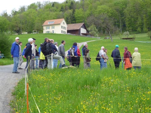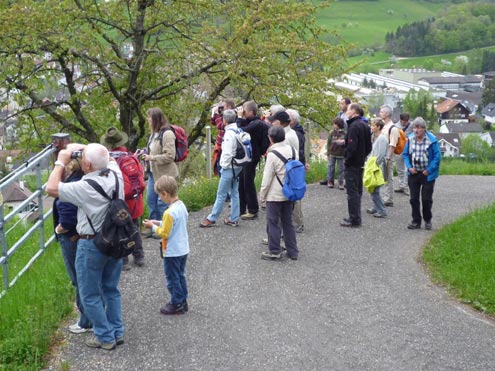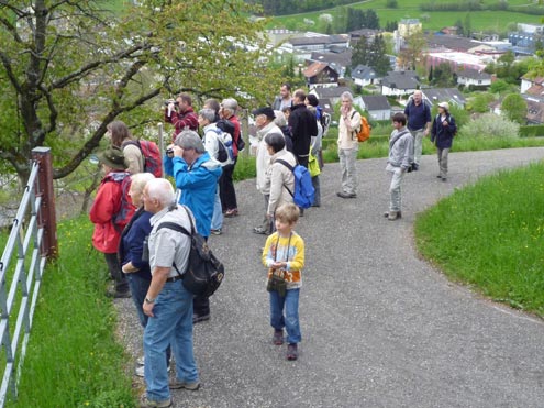 Exkursionsleiter Martin Grauwiler führte uns auf der Frühjahrsexkursion via die Gebiete Leimen und Falkenrain zur Engelsburg, wo auch das abschliessende Morgenessen eingenommen wurde.